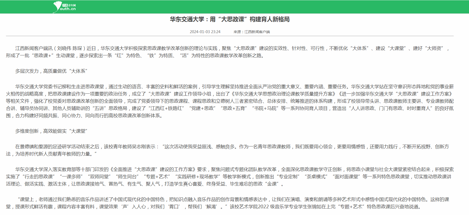 永利集团3044am官方入口站在坚守意识形态阵地和党的事业薪火相传的战略高度,把思政课建设作为一项重要的政治任务,成立了“大思政课”建设工作领导小组,出台了《永利集团3044am官方入口思想政治理论课教学质量提升方案》《进一步加强永利集团3044am官方入口“大思政课”建设工作方案》等相关文件,强化了校党委对思政课改革创新的全面领导,完成了党委领导下的思政课程、课程思政和立德树人三者紧密结合、总体安排、统筹推进的体系构建,形成了校领导带头讲、思政课教师主要讲、专业课教师配合讲、辅导员协同讲、其他人员辅助讲的“五讲”思政格局,建设了“江西红+铁路红”“党建+思政”“思政+五育”“书院+马院”等一系列协同育人项目,营造出“人人讲思政、门门有思政、时时重育人”的良好氛围,合力构建好同频共振、同心协力、同向而行的高校思政课改革创新体系。